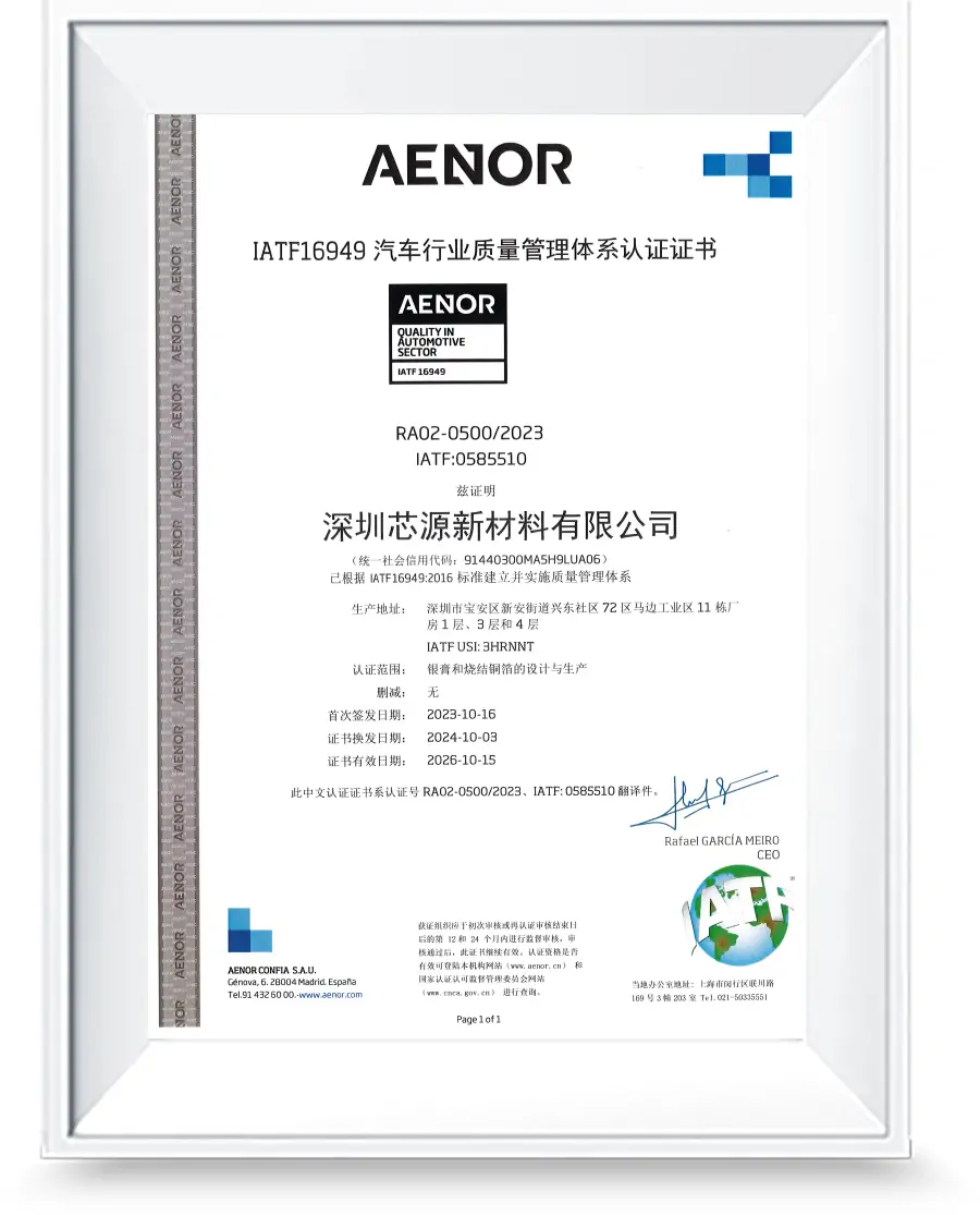 Establish and implement an automotive quality management system in accordance with the requirements of the IATF 16949:2016 international standard, covering the entire lifecycle management of silver paste and sintered copper foil, including design and development, production and manufacturing, and after-sales service. Ensure defect prevention through process and core tool applications, maintain high-quality product delivery, and pass automotive customer audits to secure qualification for entry into the automotive supply chain.