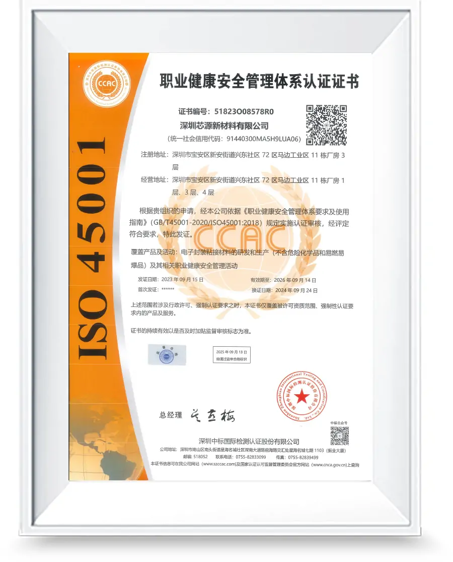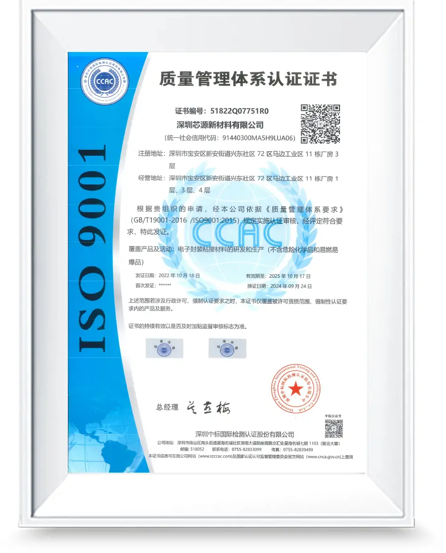 In accordance with the requirements of the ISO 9001:2015 international standard, a quality management system has been established and practiced, covering the whole life cycle management of the design, development, manufacturing and after-sales service of electronic packaging and bonding materials, so as to ensure that the quality of the whole process from raw material procurement to terminal delivery is controllable.
